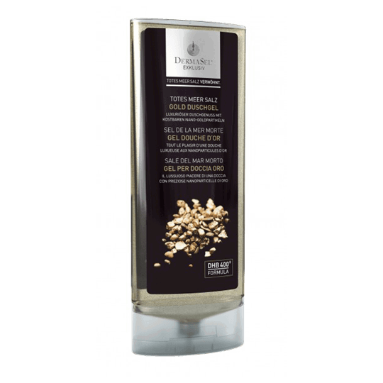 Mit dem Mineralienkomplex DHB400 ist DermaSel eine perfekte Pflege für anspruchsvolle Haut. Die Serie EXKLUSIV verbindet den einzigartigen Wirkkomplex mit besonderen Inhaltsstoffen, die die Haut pflegen, weich machen und mit Feuchtigkeit versorgen. Die Dusche Goldrausch enthält Polyquaternium-10, ein sanfter Hautconditioner, der die Haut intensiv mit Feuchtigkeit versorgt und Mikro-Goldpartikel, die auf Seidenproteine gearbeitet wurden und die Haut sanft peelen, während Sie gleichzeitig gepflegt wird.