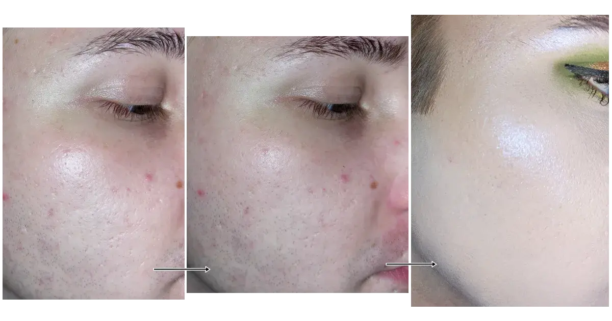 Wie man dann auf dem dritten Bild erkennen kann, sieht man ganz deutlich, wie die Poren und generell die Haut deutlich weicher, ebener und "ausgefüllter" wirken als im Vergleich zur nackten Haut, aber auch im Vergleich zum Primer alleine aufgetragen.