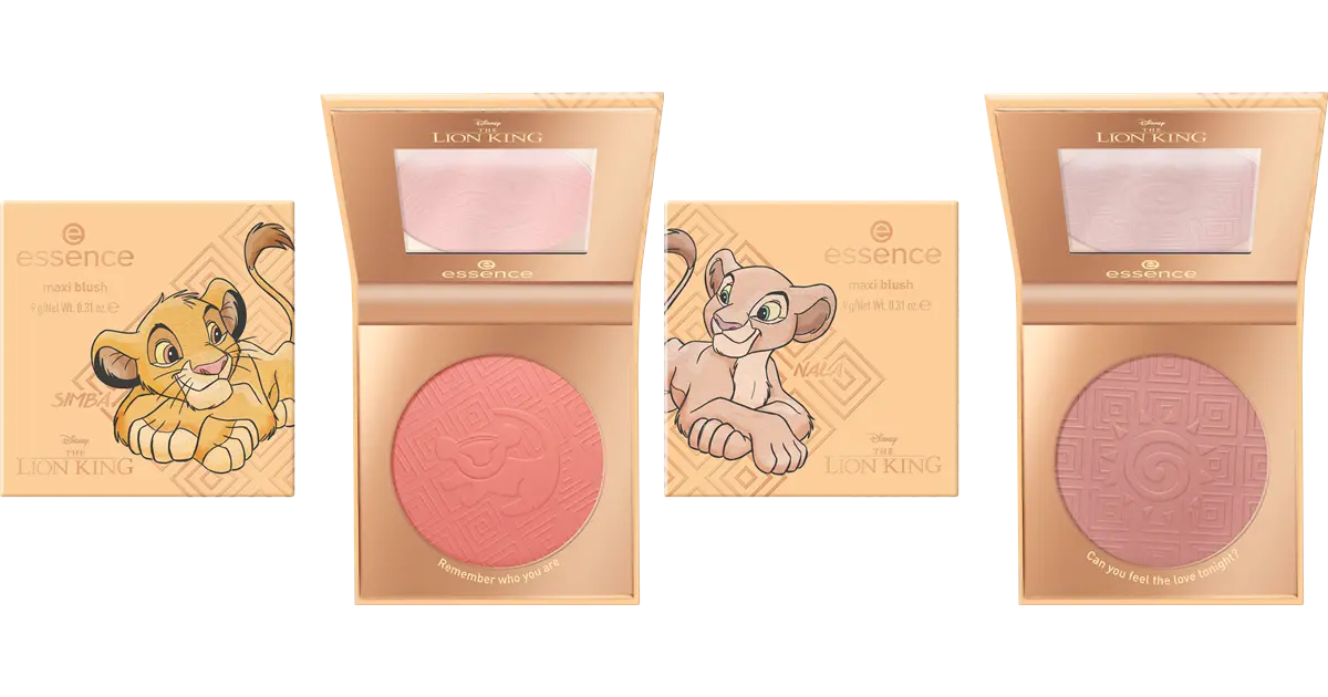 Von Simba und Nala inspirierte Produkte zaubern nicht nur ein Lächeln ins Gesicht, sondern auch einen strahlenden Teint! Die essence maxi blushes inspiriert von Disney The Lion King sorgen durch die hochpigmentierten, geschmeidigen Pudertexturen für langanhaltende Looks und lassen sich optimal verblenden. Zwei Nuancen, ein zartes Rosa und ein edler Rosenholzton, sorgen für ein natürliches Finish. Zusammen ergeben die maxi blushes ein perfektes Team – und das innen wie außen. Das Design inspiriert von den zwei Lieblingslöwen ist ein echter Hingucker!