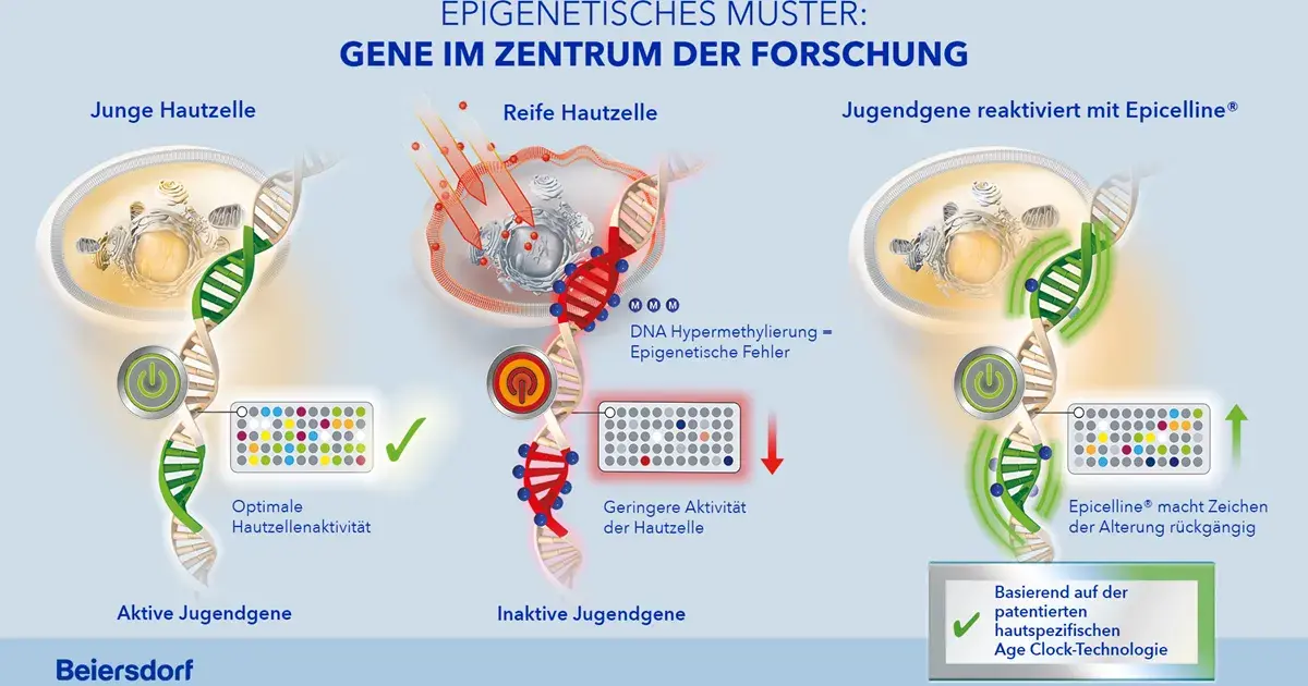 Beiersdorf forscht bereits seit 2008 im Bereich Epigenetik der Haut. Damit ist das international tätige Hautpflegeunternehmen, das allein im Jahr 2023 mehr als 240 Millionen Euro in Forschung und Entwicklung (F&E) investiert hat, eine der ersten Institutionen, die umfassende epigenetische Veränderungen während der Hautalterung festgestellt hat. Wissenschaftler*innen von Beiersdorf haben bis dato Hautproben von mehr als 1.000 Menschen analysiert. Dabei wurden pro Person 850.000 sogenannte Methylierungsstellen gemessen, um über die Analyse des individuellen epigenetischen Musters herauszufinden, welche dieser epigenetischen Marker mit der Hautalterung in Verbindung stehen. Das interdisziplinäre Epigenetik-Team von Beiersdorf aus rund 20 interdisziplinären Spezialist*innen hat außerdem inzwischen rund 50.000 Substanzen und Extrakte untersucht, um Wirkstoffe für die Hautverjüngung zu identifizieren und zu bewerten. Die Entwicklung der ersten hautspezifischen Altersuhr bei Beiersdorf begann 2016, seit 2021 ist diese patentiert.