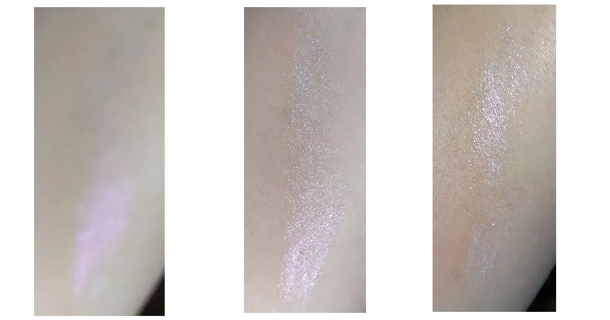 Aber nichts davon ist eingetroffen. Zwar ist der Kontakt auf die Haut zunächst ein wenig feucht und cremig, aber am Ende unterscheidet sie sich überhaupt nicht von einem pudrigen Highlighter. Er trocknet auf der Haut herunter und hinterlässt ausschließlich die so stark reflektierenden Pigmente, die das Licht so wunderschön wiedergeben.