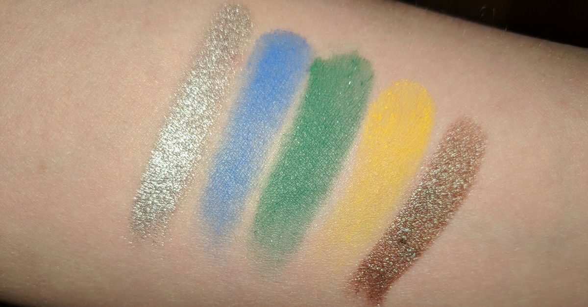 Sie enthält elf Lidschatten bzw. gepresste Pigmente und ein Rouge. Sechs Farben sind matt und sechs schimmernd, davon einer mit einem sehr starken Duochrome-Effekt. Dabei sind ein extrem helles und grelles, ausdrucksstarkes gelb, ein giftgrün, ein pink (das ist der Rouge), ein grelles neonorange, ein goldener Schimmer, ein gelbgoldener Schimmer, der Duochrome-Lidschatten, der zwischen lila und bräunlichen Tönen mit einem grünen Stich shiftet, ein violett, ein silber, ein blaugrüner Schimmer und dazu noch die beiden matten Farben schwarz und türkisblau.