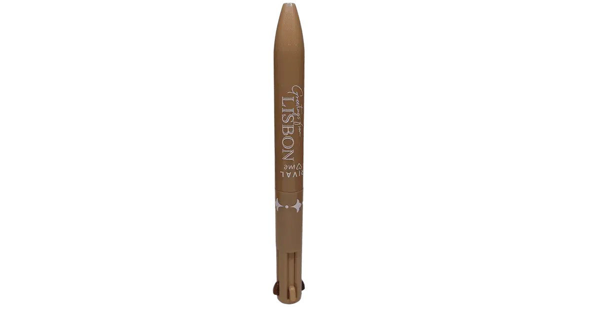 Der Augenbrauenstift ist exakt so gestaltet wie die Multifarben-Kugelschreiber, die es noch zu meiner Schulzeit gab, bei der man immer versucht hat, alle Farben auf einmal heraus zu drücken. Hier gibt es aber nur eine Öffnung aus der der jeweilige Stift heraus tritt.